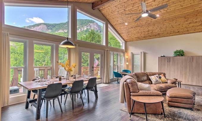 Chimney Rock Mountain takes center stage at this elegant 2-bedroom, 2-bath cottage. Choose to admire the remarkable view by the warmth of the fire in the great room, or from the comfort of the breezy back deck. Venture out to explore scenic trails of Chimney Rock Mountain State Park, a beach day on Lake Lure, or leisurely stroll on the Chimney Rock Village Riverwalk. Come home to enjoy this vacation rental's stylish mid-century modern decor, top-notch amenities, and attractive outdoor spaces.
