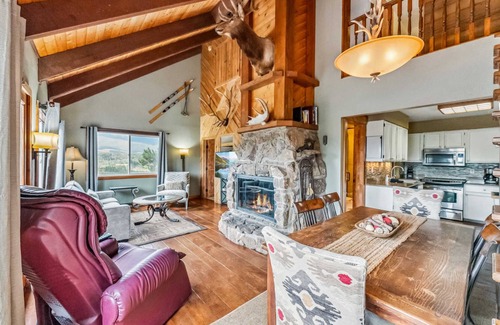 This Breck Mountain Retreat is perfect for group getaways, offering ample space for everyone to spread out and relax. With its warm mountain home charm, you'll love the vaulted ceilings, exposed wood beams, and soaring windows that frame stunning mountain views. On the main level, the cozy living room, anchored by a wood-burning fireplace, is ideal for gathering after a day of mountain adventures. The fully equipped kitchen makes it easy to prepare meals for the whole group, with a 6-person dining table perfect for shared dinners. A comfortable bedroom and full bath on this level provide a convenient spot to rest.