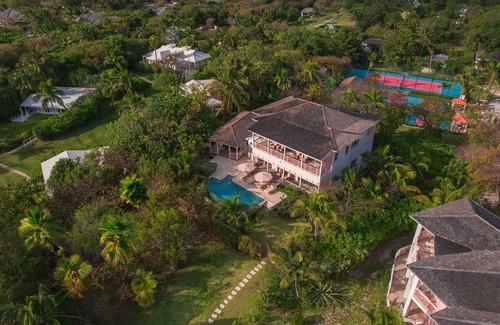 Brett's Home is your hilltop beach estate, with room for 10 guests, this 3,000 square foot private residence offers four king bedrooms with en-suite bathrooms, living room, dining room, fully equipped kitchen, and powder room. One of the bedroooms resides within a stand-alone guest cottage adjacent to the primary residence.