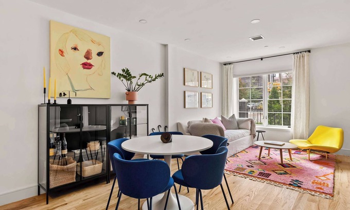 Welcome to Bridgeway, a beautifully curated 2-bedroom, 2-bath luxury retreat located in the heart of Prime Williamsburg, just steps from the iconic Domino Park and Williamsburg Bridge. Spanning 1,150 square feet on the ground floor of a modern boutique condominium, this residence blends refined minimalism with Brooklyn’s creative soul. The sunlit interior features warm oak floors, oversized windows, and a sleek open-concept layout that flows from the living area where a Restoration Hardware queen-size sleeper sofa offers extra space for guests to a dining area for four and a fully equipped chef’s kitchen with high-end appliances, quartz countertops, and custom cabinetry. High-speed Fios gigabit internet, in-unit laundry, and thoughtful design touches ensure comfort and ease for both leisure and extended stays. The tranquil bedroom includes a plush queen bed, blackout shades, and generous storage, while the spa-style bathroom features a walk-in rain shower and modern fixtures. Every detail from the matte black hardware to the serene color palette reflects elevated urban living.
