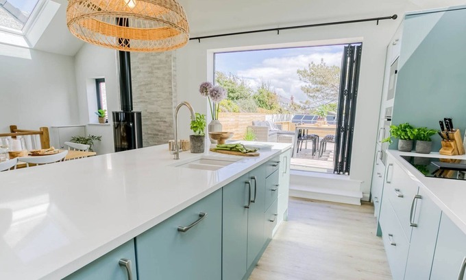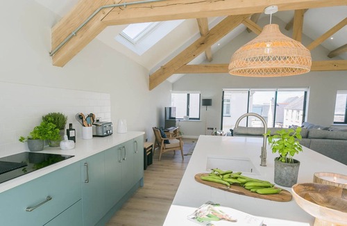 Inside you'll find four well appointed bedrooms and a family bathroom off the main corridor downstairs and stairs lead up to incredible main living area. The house has been designed to ensure that the views of the beach and sea play centre stage here, glass doors in each gable enable you can always gaze at that amazing view. There is a well equipped kitchen to one end of the living space with the huge sociable island for everyone to gather around. A dining area with lof burning stove sits to one side and beyond is the seating area where you can sit to admire the ever changing sea scape or indulge in some people watching when the village is buzzing with summer tourists. To the rear of the house is a large roof terrace, a sheltered sun trap with outside dining table and comfy sofas.