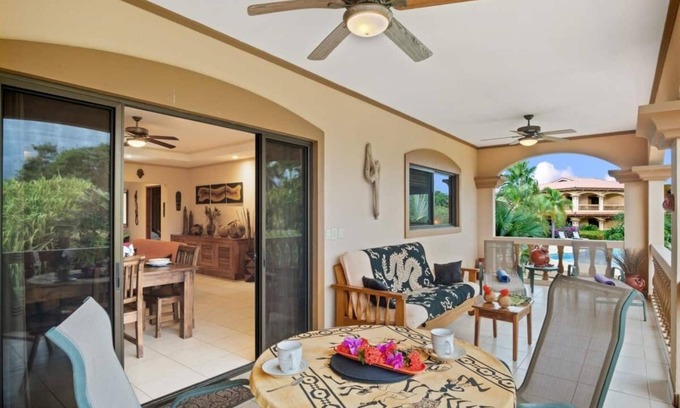 The open living area includes two sleep sofas, a dining space, and sliding doors that lead out to the balcony overlooking lush gardens. You'll enjoy full A/C, a well-equipped kitchen, washer/dryer, reliable Wi-Fi, and a serene shared pool for relaxing dips after the beach.
