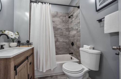 The accommodating home features a full relaxing bathroom stocked with pampering towels and toiletries, so you don't need to worry about overpacking.