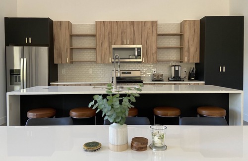 The modern architecture and bright and airy design of the home provides a relaxing, inviting and luxurious space for guests. The home consists of three bedrooms, three bathrooms, a den and a loft.