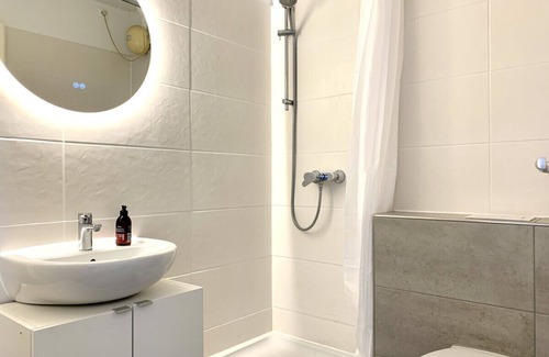 The living area includes a compact, fully equipped kitchenette with a coffee maker, cooktop, and all essential appliances, perfect for preparing meals during your stay. The stylish bathroom features a walk-in shower with a rainfall head, modern fixtures, and an illuminated mirror, creating a spa-like feel.