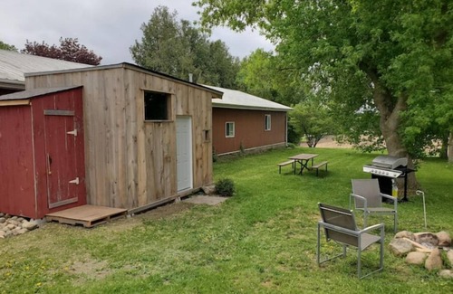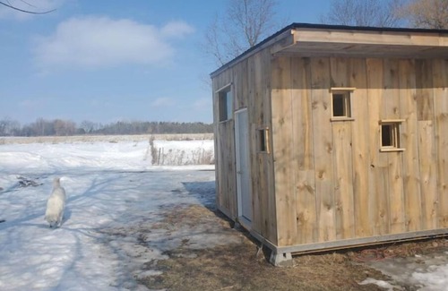 Cozy cabin on a mixed farm with great views of surrounding fields and forests. Take a walk through the property, and take in the fresh air, veggie gardens, chickens, and cattle.