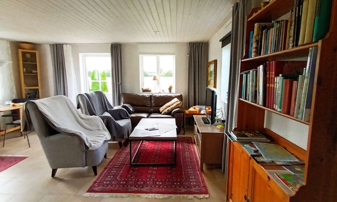 Bright and lovely cottage in Ängelholm with a view over meadows and fields. A perfect place to relax in a peaceful environment. The house has beds for four people divided between two bedrooms and a living room on the upper floor, as well as a kitchen, living room, toilet and shower on the ground floor. The garden is large and spacious with beautiful fruit trees. Enjoy the view of fields and meadows from the terrace while the food is on the grill.