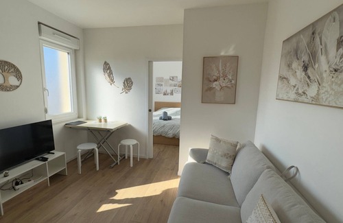 This bright and modern apartment offers a pleasant living environment, ideal for a comfortable stay in Dijon. It is decorated in neutral and calming tones, with light wood and beige dominating, creating a warm and welcoming atmosphere.