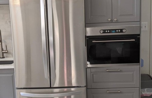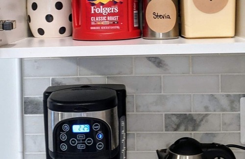 The kitchen includes a toaster oven, microwave, coffee maker, crockpot, pots and pans, cutlery, knives, cooking utensils, pots, pans, plates, bowls, cups, and Tupperware containers. We provide coffee, tea, sugar, salt, pepper, some spices, and some condiments in the fridge.