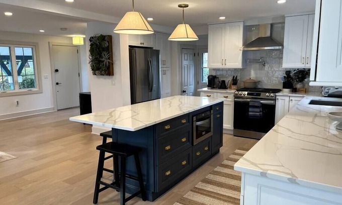 Just renovated, beautiful, spacious and bright. This is a great location for hosting, or if you need extra sleeping space for your family gathering. The first floor boasts an open concept with large kitchen island and comfy living room/dining room/family room with fireplace and Frame Tv.