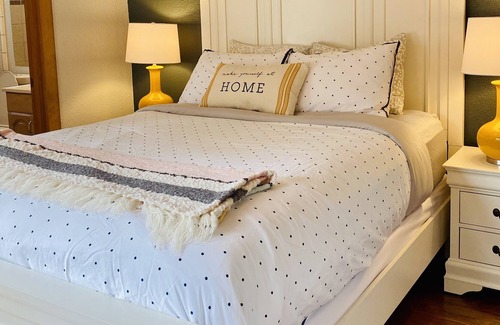 The suite is recently remodeled with a private backyard. It features a comfortable queen bed, en-suite bath with the jet-tub, full kitchen, washer/dryer onsite, and patio.