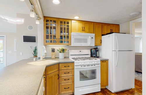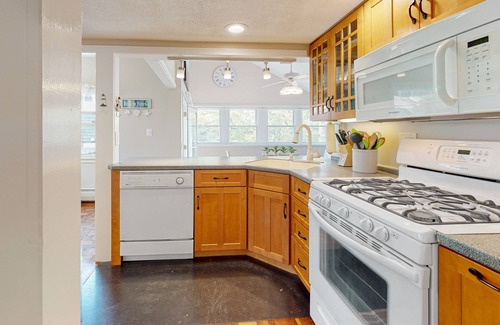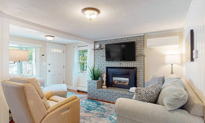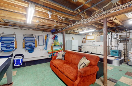 With plentiful windows and mini-split AC throughout, the house is a cool, bright respite after a day spent out and about. Enjoy a living room with a smart TV, a well-equipped kitchen, and a light-filled dining room for everything from pancake breakfasts to evening board games. Escape downstairs to the basement game room to find another smart TV, an arcade-style hoop shoot, and foosball, air hockey, and shuffleboard tables.