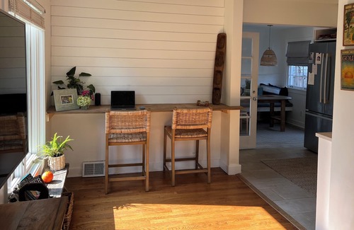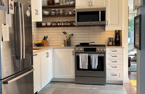 Updated kitchen with stainless steel Bosch appliances. Fully stocked with pots, pans and kitchen tools, plus lots of available spices.