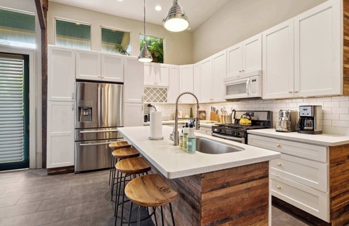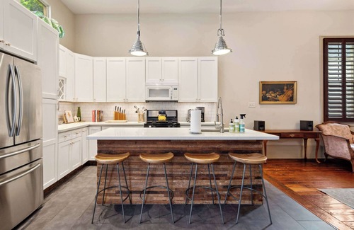 Recently restored, this 1920s home features 14 fireplaces, exposed wood, brick and hard-wood floors throughout. This 6br/4ba house spans 3,000 square feet and is decorated with a blend of vintage and mid-century modern furniture. Mahogany black-out shutters allow for the perfect sleep. Relax further in the backyard with a brand new heated pool, hot tub, and shaded pergola.