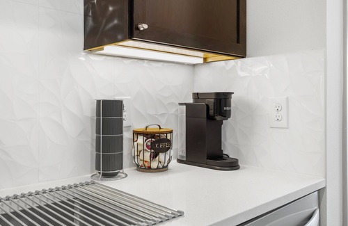 Inside, you’ll find everything you need for a relaxing stay: a fully equipped kitchen with cookware, dishes, refrigerator, dishwasher, and Keurig coffee maker; high-speed Wi-Fi with a dedicated workspace for business or remote work; a Smart TV with Roku access; central AC and heating; and an in-unit washer and dryer. After a day out, unwind with a bath or enjoy a workout in the community fitness center.