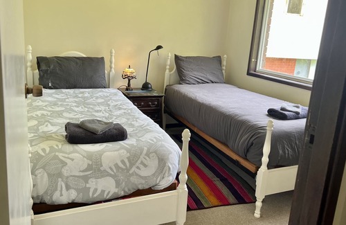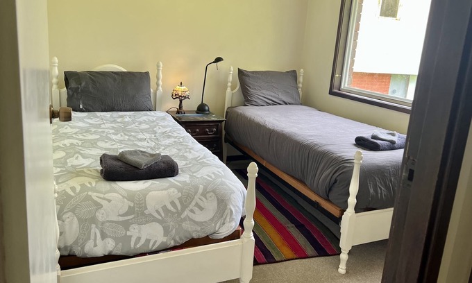 Bring the whole family to this great place with lots of room for fun. A whole family pleaser, enjoy a complimentary bottle of Sparkling Wine, lounging under the covered back verandah, a pair of King Parrots regularly fly in to say hello. Perhaps a candlelit Spring BBQ or morning coffee seated down the garden next to a beautiful running stream banked with mountain tree ferns. The garden is big enough to throw a stick for the dog, a family game of cricket, soccer or French lawn bowls.