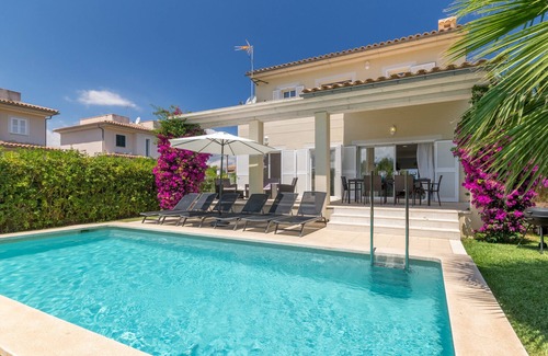 Modern family house in Barcares, for 8 persons, 4 double bedrooms, 3 bathrooms, AC, free wifi, private pool, garden with barbecue and terraces, in Barcares near AlcudiaThe cozy holiday house "Brise de Mar 2", the twin house of "Brisa de Mar 1" is located in Barcares, the extension of Alcudia, only about 200 meters from the beach, directly next to the other Villa. Barcarés is a very popular holiday area, the so-called holiday paradise for children. Eternally shallow water makes children's hearts beat faster. There is much to discover here. So scuba mask and snorkel with in the suitcases and off you go. Culture lovers prefer to stroll through the narrow streets of the old town and to indulge in local specialties in small tapas restaurants. Water sports enthusiasts can glide with their kites and surfboards through the entire "Sa Marina". A real hotspot for photographers! The old town of Alcudia and the elegant marina with a varied range of restaurants, bars and shops attract many couples and families to this beautiful holiday resort in the north of Majorca.Brisa de Mar 1 & 2 are two of our most popular vacation rentals in the area, with a quiet, yet central location near the beach, and is well-suited for all discerning travelers Relax on the pool terrace while sunbathing under Majorca's sunshine, with plenty of shade provided by a large parasol and a covered terrace by the house.Here is also the mobile grill, which is warmly welcome for culinary barbecues. There is a playground right opposite the holiday home, where your kids can let off steam.The 212m² modern interior of both houses is spread over 2 levels. The lower living area is kept open and consists of a large and very bright dining room with a long dining table, where comfortably the whole tour group can be accommodated and a cozy sofa area with satellite TV. The adjoining kitchen is super modern and equipped with a practical kitchen bar in American Style . Also from here you have direct access to the terrace. The large windows and sliding door elements let in a lot of positive daylight and create a great living environment. Before going up the stairs there are 2 double bedrooms with 2 single beds each and a bathroom in the middle which is shared here. The upper sleeping area offers 2 more large double bedrooms with double bed each. Both bedrooms have their own bathroom en suite. All bedrooms are very modern and comfortably furnished and equipped with spacious fitted wardrobes. Air conditioning is installed throughout the house. If you are traveling with babies, please let us know so we can provide you with baby cots and high chairs.You, your family and friends will feel very comfortable here. The location and facilities are really great and the best holiday weeks are sold out early every year ... We look forward to your visit!If you are looking for an accommodation for 16 people, you can rent both houses.( MAR II - ETV/3800 )