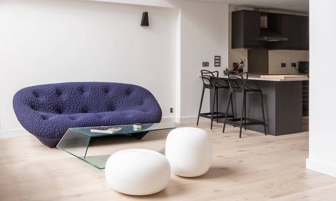 A minimalist’s dream, Britton Street III almost feels like you're entering a contemporary art gallery, thanks to its perfectly positioned design-led statement furniture and lighting pieces along with an impressive double-height living room with floor-to-ceiling windows. Set over two levels, the two bedrooms can be found on the upper floors, with the master bedroom and its ensuite bathroom featuring a balcony and the second bedroom overlooking the living area by way of a glass panel. The living room is part of an open-plan layout that includes a sleek and compact kitchen, as well as a dining area, creating a sociable atmosphere. The ideal base for a business traveller or a group of friends, the home is located on a quiet back street in Clerkenwell, amongst restaurants like St. John, and a short walk from the pubs, eateries, and bars in Farringdon.