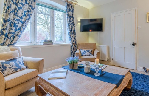 Overlooking the front of the cottage, the traditionally styled, warm, and welcoming living room features a huge fireplace with a wood-burning stove, flanked by two comfortable sofas which sit on either side of the coffee table. Victorian-style artwork hangs on the walls and there's a wall-mounted TV in one corner. On the bookshelf beneath the TV, there's a selection of board games to enjoy, and throughout the house, guests will find plenty of reading material including novels, cookery books and interior design and gardening reference books.