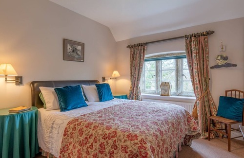 This spacious room boasts a king-size bed with nightstands and reading lights on either side. The cast iron fireplace (not in use) is a lovely, original feature as is the deep-set, stone mullion window overlooking the front of the cottage, offering views across the valley and surrounding hills. There are hooks with coat hangers in one corner (there's a hairdryer hanging in a bag here too) and an antique five-drawer chest of drawers for further storage, topped with a triple stand dressing table mirror.