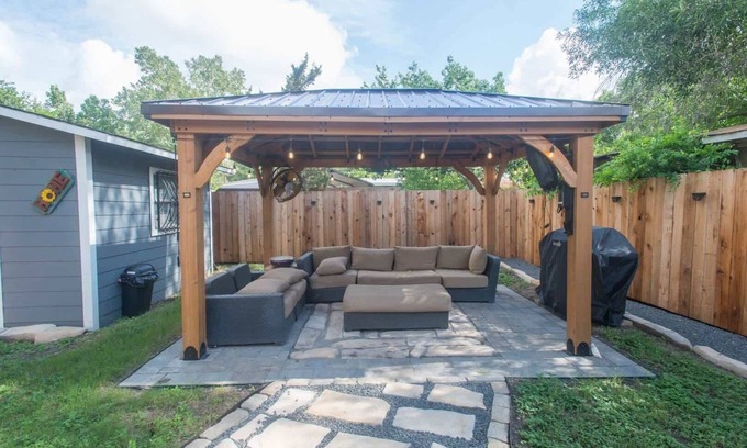 Step outside into your private backyard oasis, where a covered cabana with cushioned seating invites long conversations under string lights. Fire up the grill, gather around the firepit, and toast to unforgettable evenings in San Antonio.