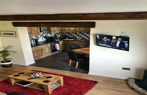 Open plan beamed lounge with rustic oak floor, two leather settees, log effect remote control fire, gas central heating, wall mounted 32" television with freeview/dvd and separate Hi-fi.