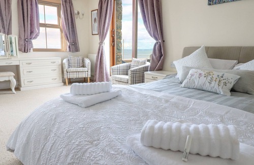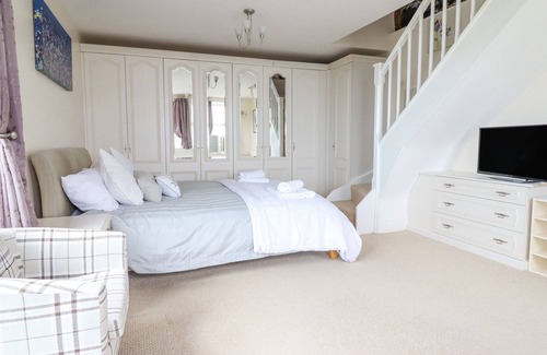 Amenities: Oil central heating. Electric oven, electric hob, fridge, freezer, washing machine, tumble dryer, dishwasher, wine cooler. 3 x TV, WiFi, soccer table. Fuel and power inc. in rent. Bed linen and towels inc. in rent. Off-road parking for 3 cars. Front enclosed garden with patio, inflatable hot tub and furniture and rear enclosed garden with raised patio and furniture. Stone BBQ. Two well-behaved dogs welcome. Sorry, no smoking. Shop 1.4 miles, pub 1.3 miles, beach 0.5 miles. Note: King-size en-suite is reached via a staircase within the room. Note: There are 6 steps to enter the property and steps to access the rear patio. Please note: We cannot allow fireworks at this property
