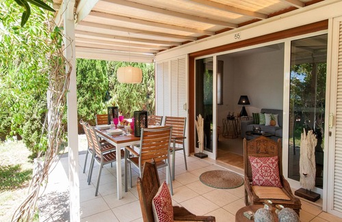 Bungalow Melocotones NF is equipped with a very well equipped kitchen with oven, microwave and other utensils to make your stay more pleasant, the kitchen is open to the living room from which you can access the terrace and garden through its large windows. The whole house has a different and very special decoration, which makes it a unique property.