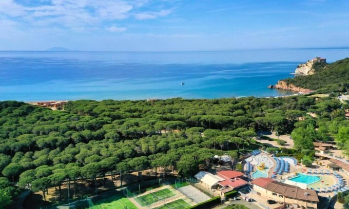 Nestled in the colours and scents of the Mediterranean sea, this resort offers the comforts of lovely bungalow, with own private outdoor spaces and amenities ideally for families and their children. It is in a great location to visit Maremma and the cities of arts that surrounds it (Siena, Pisa, Florence, Rome). 2 swimming pools (swimming cap compulsory) with deck chairs and sun shade, one for children and one with hot tub next to the main facilities. Large resort. In the hamlet Rocchette 7 km from the centre of Castiglione della Pescaia, in a quiet position, 150 m from the sea, road to cross. For shared use: 2 swimming pools (depth 150 cm, seasonal availability: 12.Apr. - 02.Nov.). WC in the pool area, children's pool, outdoor shower, hot tub, tennis, beach volleyball, children's playground. In the complex: reception, restaurant, bar, WiFi, shopping facilities, washing machine, tumble dryer (for shared use, extra), bicycle rental. Available: canoe (extra). Breakfast full board half board possible on request (extra). Parking on the premises. E-charging station. Supermarket 8 km, bus stop 50 m, sandy beach "Le Rocchette" 150 m. Marina 10 km, golf course (18 hole) 20 km, riding stable 10 km. Nearby attractions: Punta Ala 12 km, Follonica 20 km, Massa Marittima 30 km. Please note: entertainment in the season. Suitable for families. The holiday properties may differ in situation, size and location. Access to the sea with a free beach (free) or equipped beach for guests (extra on request) is located in front of the Residence. Restaurant, pizzeria, bar, supermarket, butcher, ATM, soccer, outdoor fitness area, padel field, large playground and animation (30.05–27.09 ca).