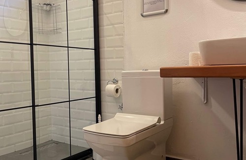 an ensuite bathroom with a shower cabin, permanently supplied with hot water, with thick and soft towels and a hair-drier