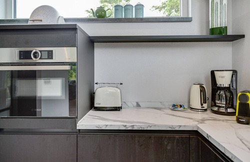 Layout: Ground floor: (open kitchen(hob(induction), electric kettle, toaster, coffee machine(cups, filter), combination microwave, dishwasher, fridge-freezer, Juicer), Living/diningroom(TV(flatscreen, smart TV), dining table(6 persons), seating area(6 persons)), Bedroom with bathroom(single bed(boxspring, 90 x 210 cm), single bed(boxspring, 90 x 210 cm), bath tub, shower(walk-in shower)), toilet)