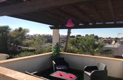 Private urbanization 1.5 km from the beach, very close to La Zenia shopping center, Torrevieja hospital, close to shops and services, with public transport at the door, the urbanization has two swimming pools, the house has two rooms one with a double bed and in the other bed a convertible bed to a double bed also, a sofa bed in the living room, kitchen, living room and bathroom, surrounds a patio of 50m and the upper floor is a private solarium of 45 m2 with barbecue.