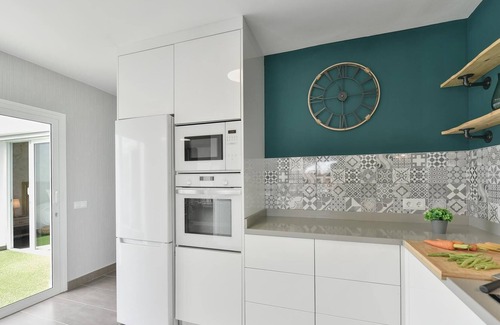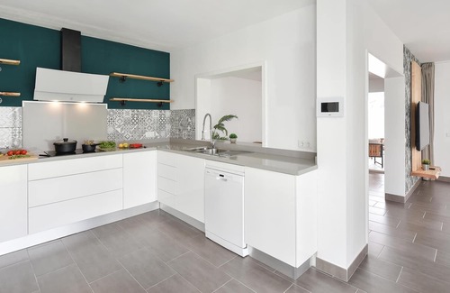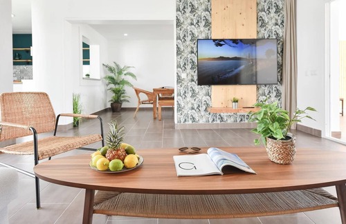 This villa's main bedroom counts with a double bed that connects to another room with a double sofa bed, perfect for families with children! It also has 3 other bedrooms interconnected with each other provided with single beds, 3 bathrooms with shower, a tastefully decorated living room with air conditioning and smartTv in addition to a beautiful fully equipped kitchen, with oven, dishwasher, cutlery, coffee maker, microwave, and all the necessary items for a comfortable stay.