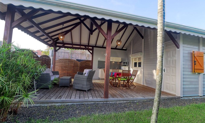 Located in the residential area of Pont Café in Sainte Luce (South Carribean of Martinique), the bungalow is 300m from the Corps de Garde beach and about 500m from Fond Banane beach. The 20m² bungalow hosts a large double bed and with a bathroom (shower, WC, sink). Facing the garden, the covered terrace is approximately 30m² with outdoor kitchen, outdoor lounge and dining area
