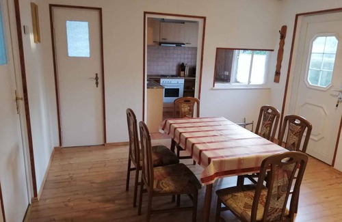 The detached bungalow built in 1973, was renovated in 2008 and is furnished in a functional and typical country style. The property is located in a holiday resort. Also due to its quiet and sunny location at the edge of the forest the domicile is popular. Available for shared use: parasol, children's playground, swing, sandpit, climbing frame, barbecue facilities, terrace and garden furniture. 500 sqm garden with terrace (garden furniture and barbecue) for exclusive use at Bungalow.LocationFuhlendorf. The bungalow is located in a holiday complex, on a 6000 sqm enclosed forest plot with meadow, flowers and shrubs. 8 bungalows are rented. 4 Bungalows to holiday guests. Bungalow MEK VOR 022 (6 people), MEK VOR 023 (2 persons), MEK VOR 044 (6 people) and MEK VOR 045 (2 people). Access is via a side road (unpaved, length 100 m). Parking is available on the property. Specialelectric heating.Facilities: high chair. TV reception takes place via satellite. Please bring your own sheets and towels or order at booking. Leisuretable tennis. Dogsallowed, EUR 51.00/pet per week. DistancesShopping 1000 m, restaurant 1000 m, town center 1000 m. railway station, discotheque each 8 km in Barth. Rostock and Stralsund with other recreational possibilities in each 45 km. In summer: Saaler Bodden 500 m in Fuhlendorf (beach 3 km featuring meadow and sand). boat launch in 3 km. horse riding in Barth 8 km. golf in Ribnitz Damgarten 18 km. fishing in Saaler Bodden 500 m. Baltic Sea with dog beach in Zingst 13 km, Bodden tours from the harbor in Fuhlendorf 2 km. DivisionBungalow, 1 floor, 3 rooms (including 2 bedrooms), 60 sqm, in total 6 beds (including 1 additional bed). RoomThe entrance to your bungalow leads directly into the hallway with wardrobe and doors to all rooms. In the hallway there is a dining table for 6 people. Living room with sitting area, TV and DVD player. Bedroom with 1 double bed. Bedroom with 1 double bed, 2 cots and The bunk bed is there as a children's bed. Kitchen with dining area (3 seats), electric stove (4 plates), oven, fridge (icebox), coffee machine, toaster and electric kettle. Bathroom with shower, 1 washbasin, WC and window. Terms of lease and pricesIncluded in the pricehigh chair, parking place, electricity, water. Side costs-Costs on the spot:/Obligatory:final cleaning 50 € per object per stay. local tax by local tariff.On request:heating 0,48 € per kilowatt hour based on usage. laundry package (bed linen, hand towels beach towel) 10 € per person per first time use and changing. Bed linen (please order at booking) 5 € per person per first time use and changing.Deposit:EUR 50,-/object.