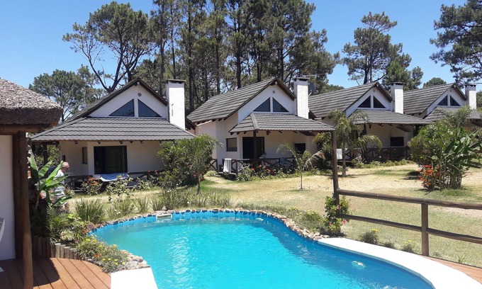 Contamos con verdaderos bungalows de excelente estilo, de 75 m2, ubicados a una cuadra de la playa, sumamente confortables, luminosos y de buen aislamiento térmico, equipados para 2 a 7 personas.Cada bungalow cuenta con:- Dos dormitorios, cama somier de 1,60 m. x 2 m., con colchn a resortes, 3 camas sommiers individuales, 1 sofa cama y cómodos placards. Bao completo con canillas monocomando. Termotanque eléctrico.- Amplio estar con cocina integrada, bar/barra desayunadora, TV LCD 32 con Direct TV, sofá cama y estufa a lea.- Cocina totalmente equipada y amoblada, separada del estar por la barra desayunadora, cuenta con heladera con freezer, microondas, horno convencional a gas con 4 hornallas, bajo mesada, alacenas, cafetera, tostadora eléctrica, vajilla completa, etc. Todos los ambientes cuentan con ventilador de techo.- Deck techado con parrillero y amplia vista al parque que est rodeado de bosque (no se suspenden los asados por lluvia o pleno sol). Cochera individual al lado de cada bungalow. Cajas de seguridad Wifi gratuito en todo el complejo, las 24 horas del da.- Cámaras de seguridad en todo el complejo.