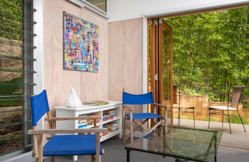 “This is a magical spot! Beautiful house located 1 quiet street back from Smiths Lake and well hidden behind shrubs and trees. The space is stylish, light and airy, with lovely new bathrooms & a large, well-equipped kitchen. Close to exceptional beaches including Cellito, Blueys & Seal Rocks.
