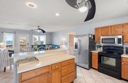 Situated on an elevated lot with fantastic ocean views, C And Sky is a charming 4-bedroom cottage with coastal touches and updates throughout, plus a location that can't be beat. The bright and airy great room features an open-concept layout and plenty of windows to maximizes the ocean views. The kitchen includes a large island with bar seating that overlooks the living area, perfect for mingling with family and friends even while preparing meals. You'll have plenty of space for outdoor living too, with a sun deck on the front of the house for watching the sunrise and enjoying the ocean breeze, and another on the back of the house overlooking the pool area below. Downstairs, the covered ground level provides plenty of shade along with all the amenities you'll need for a beach vacation, including an outdoor shower, hot tub and grilling area. When you're not at the beach, take advantage of the private pool for around-the-clock fun and relaxation without leaving the house. Beyond the pool is a spacious backyard for playing games or just letting the kids run around.