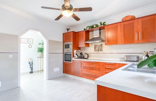 This villa offers a spacious open plan living. With its exquisite dining room that leads on to the spacious and beautifully planned lounge. From the leather sofas you can watch the 50” SMART TV with BBC1, BBC2, ITV, Netflix and full SKY package satellite programs. Also available are DVD’s, games, books and a laptop is supplied for your use. Fibre Optic Internet is available throughout the villa so you can listen to your favourite music with the new Apple Homepod, a breakthrough speaker that adapts to its location and delivers high-fidelity audio. The light and airy lounge leads out by its double doors to the terrace and pool, BBQ and outdoor dining area. For guests looking to self-cater you can enjoy a modern style kitchen, fully equipped with oven, fridge, freezer, dishwasher, microwave, washing machine and a variety of smaller appliances designed to make catering nice and easy.