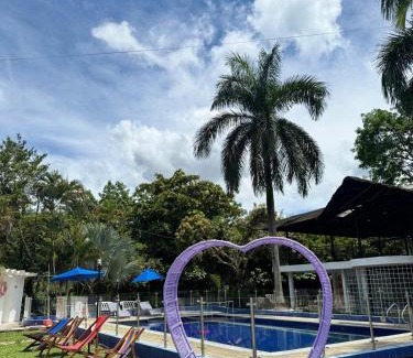 Cabaña Las Ceibas is a recently renovated chalet in Nocaima where guests can make the most of its outdoor swimming pool, garden, and bar. This property offers access to a balcony, free private parking, and free Wifi. Providing a terrace and river views, the spacious chalet includes 2 bedrooms, a living room, flat-screen TV, an equipped kitchen, and 3 bathrooms with a shower. The property has an outdoor dining area. Guests at the chalet can enjoy an American breakfast. Guests can eat at the on-site family-friendly restaurant, which is open for dinner, lunch, brunch, and cocktails. Dining options are available close to Cabaña Las Ceibas. For guests with children, the accommodation provides outdoor play equipment. El Dorado International Airport is 39 miles away.