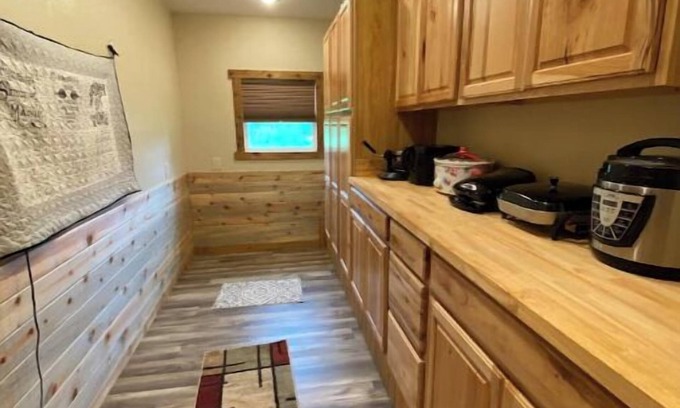 BR 1 king size sleep number/early American handmade aspen wood furniture. Helps with a cabin feel. BR 2 a twin size trundle bed. Good mattress. BR1&3 guests will pass through BR2 space to go to bathroom 1. Bathroom 1 has X-Large shower, body wash, shampoo& lotion Bedroom 4 has a large private shower w/body wash, shampoo& lotion and closet toilet. Solid door entry for privacy, large closet, personal controls for sleep number and split unit a/c. Early American handmade aspen wood furniture. Living room w/2 leather recliners/leather reclining couch, 60 inch TV w/DIRECT TV, wood burning stove. Kitchen, living room, dining room all open area. Filtered water furnished with PRIMO water dispenser with coffee pods furnished. Flour, sugar, tea bags, coffee beans w/grinder and pot furnished.