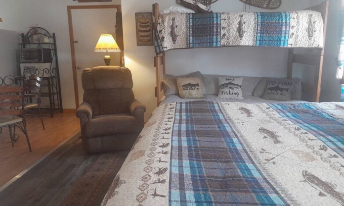This accommodation has a king bed, a bunk bed with a futon on the bottom and single on the top. It has a fully equipped eat in kitchen, Direct TV w/ HBO & Wifi, outdoor fire pit and charcoal grill.