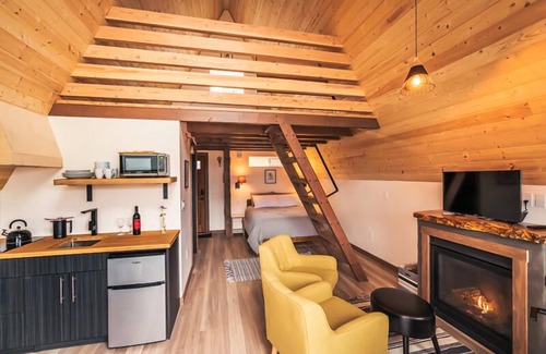 Cabin 4 features and out door soaking tub, sleeps 4. Short walk to restaurants and the waterfront. Free onsite parking and WIFI through out the property. There is a communal deck under the ancient fir trees with a gas fire pit. Local eagles love perching in these trees. This A-frame cabinhas 2 queen beds (one on main level and one in the loft), TV, private patio,fully equipped kitchenette, gas fireplace, A/C, rain shower bathroom and an outdoor bathtub patio. Each of our cabins features the artwork of some of the most prominent artists of the Columbia Gorge.
