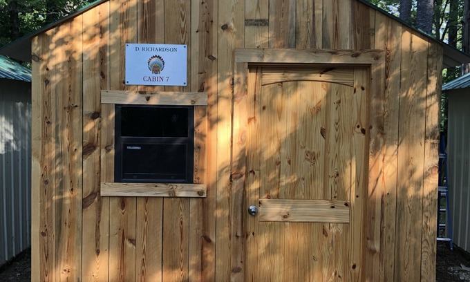 This listing is for Cabin 8 with all campground amenities. Cabin 8 is a standard rental and comes with 1 full size bed AND 1 twin bed with sheets, blankets, pillows and comforters. Also included are a floor fan, electricity, portable heater, air conditioning, concrete floors with wood walls, clothing rack with hangers, luggage storage rack, and wood ceiling.