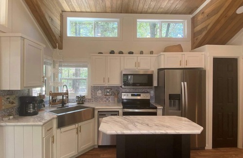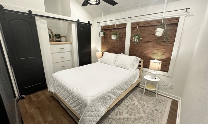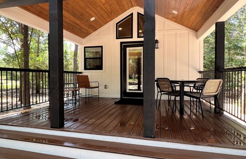 We LOVE helping our guests enjoy quiet and comfortable vacations and invite you to indulge in the epitome of modern rustic elegance amidst the picturesque piney woods of East Texas. This striking tiny home boasts a sleek all-black exterior that exudes contemporary sophistication and blends harmoniously with its natural surroundings. The location provides for quick and easy access to nearby lakes, state parks, marinas, casual and friendly fooderies, event venues, breweries, and wineries.