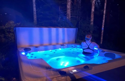 We have one outdoor security camera near the entrance to the front door so that we can monitor the weather and safety of our cabin, as we do not live nearby. The camera does not view the hot tub area of the cabin.