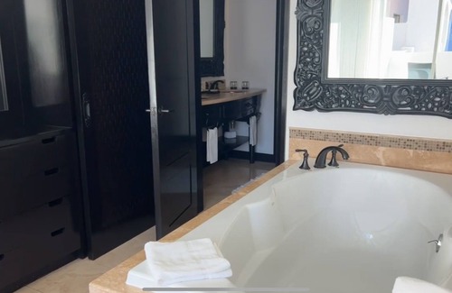 Located in San José del Cabo, this resort is a dream. With its fantastic amenities like beachfront, 2 swimming pools, 2 restaurants, movie theater, spa, fitness center, and free Wifi. Guests will have everything they need for a pleasant stay. The lovely bedroom features a comfortable king bed, while the bathroom offers a refreshing shower and a jetted bathtub with his/her sinks. Additionally, there is an additional space with a cozy living room with a sofa bed. Moreover, enjoy the view as you look from the balcony. Directly across the street of the resort will offer multiple restaurants and shopping. Our place will help you feel at home while you're traveling in San José del Cabo.