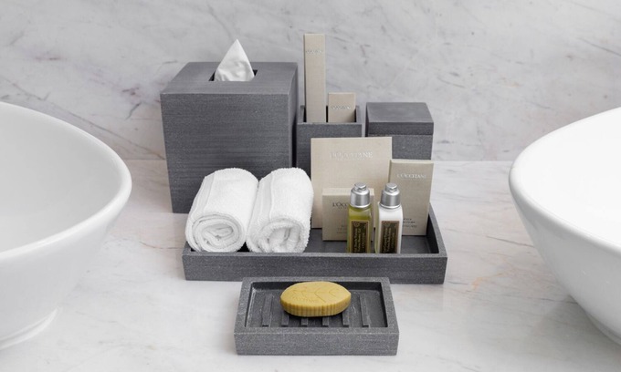 Suite Amenities: Air conditioning, Living room area, Blender, Security box, Electric 4-burner stovetop, Telephone, Dining table, Refrigerator, Fully-equipped kitchen, Tea/Coffeemaker, Smart TV, Climate control, Microwave, Dishes, silverware, and kitchenware, Iron & ironing board, Remote Control curtains