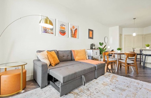 ☀️This top-floor, sunlit 1BR suite blends comfort & style: private balcony, espresso bar, spa-like bathroom, large Smart TV, laundry and kitchen island with new appliances. Pull-out sofa sleeps 2 extra guests 🛌