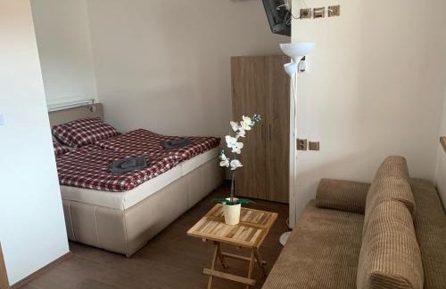 Café de la Crème offers air-conditioned accommodations in Kuželov. Both free Wifi and parking on-site are accessible at the guest house free of charge. Outdoor seating is also available at Café de la Crème. The accommodation provides guests with a terrace, a seating area, a flat-screen TV, a fully equipped kitchenette with a fridge and a stovetop, and a private bathroom with shower. Kitchenware and kettle are also offered. At the guest house, the units include bed linen and towels. There is a coffee shop and bar. Guests can relax in the garden at the property. Cachtice Castle is 21 miles from Café de la Crème, while Penati Golf Resort is 22 miles from the property.